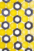 Czarne cekiny na żółtym tle. czarne okręgi są rozrzucone na żółto. Żółte tło z czarnymi dekoracjami.