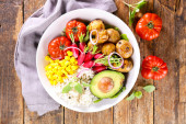 Zdjęcie "Zdrowa miska obiadowa: jajko, tuńczyk, awokado, pomidory wiśniowe, sałatka kukurydziana, cebula. Widok z góry" może być wykorzystywane do celów osobistych i komercyjnych zgodnie z warunkami zakupionej licencji Royalty-free. Obraz jest dostępny do pobrania w jakości wysokiej rozdzielczości do 5760x3840.
