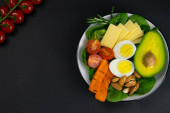 Zdrowa miska obiadowa: jajko, tuńczyk, awokado, pomidory wiśniowe, sałatka kukurydziana, cebula. Widok z góry