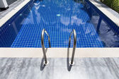 Poręcze drabinkowe ze stali nierdzewnej umożliwiające zejście do basenu. Basen z poręczą. Drabina basenu. Strzał w poziomie. basen ze schodami. Drabinka ze stali nierdzewnej