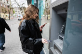 Młoda kobieta w skórzanej kurtce wkładająca kartę kredytową do bankomatu na świeżym powietrzu, patrząc na smartfona.