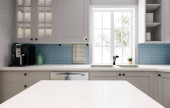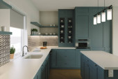 Przestronna, jasna kuchnia z niebieskim splashback i metalicznym niebieskim stołkiem barowym. 3d renderowanie.