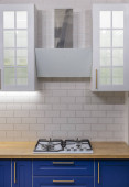 Zdjęcie "Przestronna, jasna kuchnia z niebieskim splashback i metalicznym niebieskim stołkiem barowym. 3d renderowanie. " może być wykorzystywane do celów osobistych i komercyjnych zgodnie z warunkami zakupionej licencji Royalty-free. Obraz jest dostępny do pobrania w jakości wysokiej rozdzielczości do 5760x3840.