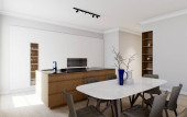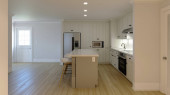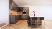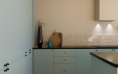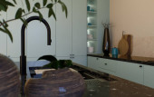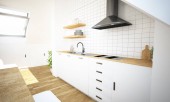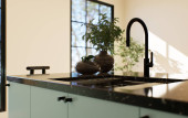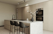 Nowoczesna przestronna, jasna kuchnia z nasłonecznieniem i ciemnymi akcentami. Wizualizacja 3D. Zielona kuchnia z minimalnymi frontami, czarne stołki bar, wyspa z szufladami i naczynia kuchenne.