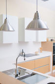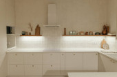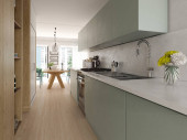 Nowoczesna przestronna, jasna kuchnia z nasłonecznieniem i ciemnymi akcentami. Wizualizacja 3D. Zielona kuchnia z minimalnymi frontami, czarne stołki bar, wyspa z szufladami i naczynia kuchenne.
