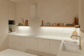 Zdjęcie "Nowoczesna przestronna, jasna kuchnia z nasłonecznieniem i ciemnymi akcentami. Wizualizacja 3D. Zielona kuchnia z minimalnymi frontami, czarne stołki bar, wyspa z szufladami i naczynia kuchenne." może być wykorzystywane do celów osobistych i komercyjnych zgodnie z warunkami zakupionej licencji Royalty-free. Obraz jest dostępny do pobrania w jakości wysokiej rozdzielczości do 5760x3840.