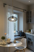 Zdjęcie "Duża biała kuchnia z wyspą i wszelkimi niezbędnymi urządzeniami. Renderowanie 3D. Drewniane stołki barowe, żyrandol nad wyspą, duże wysokie szafki." może być wykorzystywane do celów osobistych i komercyjnych zgodnie z warunkami zakupionej licencji Royalty-free. Obraz jest dostępny do pobrania w jakości wysokiej rozdzielczości do 5760x3840.