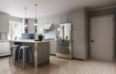 Duża biała kuchnia z wyspą i wszelkimi niezbędnymi urządzeniami. Renderowanie 3D. Akcent jest na kamiennym szczycie z białym marmurem, pralka znajduje się na wyspie.