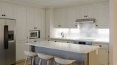 Duża biała kuchnia z wyspą i wszelkimi niezbędnymi urządzeniami. Renderowanie 3D. Duża przestronna kuchnia w jasnych kolorach i malowane fasady.