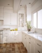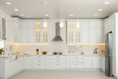Zdjęcie "Duża biała kuchnia z wyspą i wszelkimi niezbędnymi urządzeniami. Renderowanie 3D. Duża przestronna kuchnia w jasnych kolorach i malowane fasady." może być wykorzystywane do celów osobistych i komercyjnych zgodnie z warunkami zakupionej licencji Royalty-free. Obraz jest dostępny do pobrania w jakości wysokiej rozdzielczości do 5760x3840.