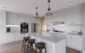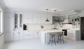 Duża biała kuchnia z wyspą i wszelkimi niezbędnymi urządzeniami. Renderowanie 3D. Duża przestronna kuchnia w jasnych kolorach i malowane fasady.