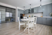 Zdjęcie "Duża biała kuchnia z wyspą i wszelkimi niezbędnymi urządzeniami. Renderowanie 3D. Duża przestronna kuchnia w jasnych kolorach i malowane fasady." może być wykorzystywane do celów osobistych i komercyjnych zgodnie z warunkami zakupionej licencji Royalty-free. Obraz jest dostępny do pobrania w jakości wysokiej rozdzielczości do 5760x3840.