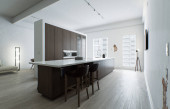 Zdjęcie "Przestronna drewniana kuchnia z białym marmurem. Renderowanie 3D. Kuchnia z zaokrągloną wyspą i czarnymi drewnianymi stolcami. Kuchnia z urządzeniami i przyborami." może być wykorzystywane do celów osobistych i komercyjnych zgodnie z warunkami zakupionej licencji Royalty-free. Obraz jest dostępny do pobrania w jakości wysokiej rozdzielczości do 5760x3840.
