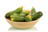 Trzy dojrzałe zielone ogórki na glinianej płycie, makro, izolowane na białym tle.