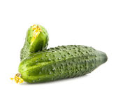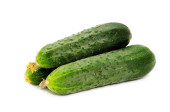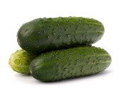Trzy dojrzałe ogórki na drewnianej tablicy kuchennej, makro, odizolowane na białym tle.