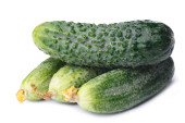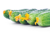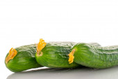 Trzy dojrzałe zielone ogórki w jałowej torbie, makro, izolowane na białym tle.