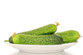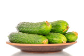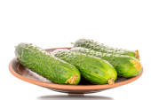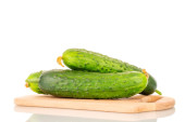 Trzy dojrzałe zielone ogórki na metalowej tacy, makro, izolowane na białym tle.