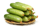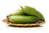 Kilka dojrzałych zielonych ogórków na słomkowym talerzu, makro, izolowane na białym tle.