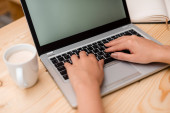 zbliżenie biznes kobieta ręcznie wpisując na klawiaturze laptopa i cof