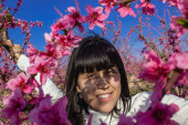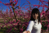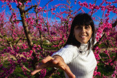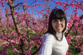 Biała kobieta wśród pięknych różowych kwiatów brzoskwiń, w Lleida, Hiszpania.
