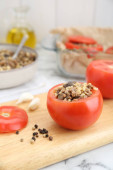 Pyszne pomidory z mieloną wołowiną, bulgurem i grzybami w naczyniu do pieczenia na drewnianej desce