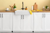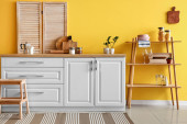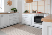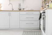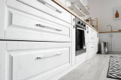 Zdjęcie "Stół z szufladami we wnętrzu stylowej kuchni" może być wykorzystywane do celów osobistych i komercyjnych zgodnie z warunkami zakupionej licencji Royalty-free. Obraz jest dostępny do pobrania w jakości wysokiej rozdzielczości do 5760x3840.
