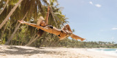 Portret szczęśliwej kobiety z filiżanką kawy lub herbaty w białym ręczniku po kąpieli, stojącej na otwartym balkonie kurortu na tle natury w idealny poranek w tropikalnym kraju