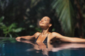 Zdjęcie "Portret szczęśliwej kobiety z filiżanką kawy lub herbaty w białym ręczniku po kąpieli, stojącej na otwartym balkonie kurortu na tle natury w idealny poranek w tropikalnym kraju" może być wykorzystywane do celów osobistych i komercyjnych zgodnie z warunkami zakupionej licencji Royalty-free. Obraz jest dostępny do pobrania w jakości wysokiej rozdzielczości do 5760x3840.