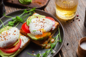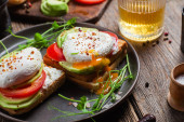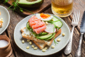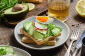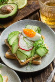 Tosty z białego chleba z serem śmietankowym, jajkiem, awokado, ogórkiem i rzodkiewką na talerzu