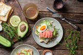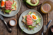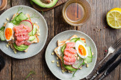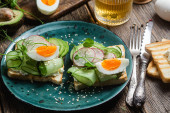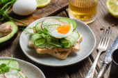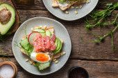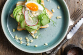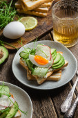 Tosty z białego chleba z serem śmietankowym, jajkiem, awokado, ogórkiem i rzodkiewką na talerzu
