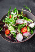 sałatka ser zielony liście warzywa rzodkiewka, pomidor, ogórek posiłek jedzenie przekąska na stole kopia przestrzeń jedzenie tło rustykalny widok z góry