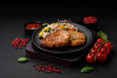 Pyszne smażone ryby okonia morskiego w postaci plastrów z przyprawami i ziołami na ceramicznej płycie na ciemnym betonowym tle