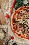 Pizza z serem z kurczaka i pepperoni, którego kawałek jest krojony i układany jak pakman, jest na drewnianej desce i brązowym tle. Ser rozprzestrzenia płynące smugi. Wysokiej jakości zdjęcie