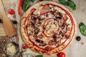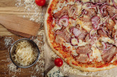 Zdjęcie "Pizza z serem z kurczaka i pepperoni, którego kawałek jest krojony i układany jak pakman, jest na drewnianej desce i brązowym tle. Ser rozprzestrzenia płynące smugi. Wysokiej jakości zdjęcie" może być wykorzystywane do celów osobistych i komercyjnych zgodnie z warunkami zakupionej licencji Royalty-free. Obraz jest dostępny do pobrania w jakości wysokiej rozdzielczości do 5760x3840.