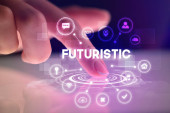 Ręczne wskazanie na napis FUTURISTIC, koncepcja nowoczesnej technologii