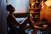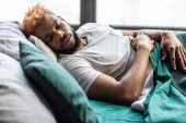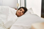 Zdjęcie "Młody człowiek z zespołem pourazowym leżący w łóżku przy stoliku nocnym z whisky, zdjęciami i butelką tabletek nasennych i próbujący zasnąć" może być wykorzystywane do celów osobistych i komercyjnych zgodnie z warunkami zakupionej licencji Royalty-free. Obraz jest dostępny do pobrania w jakości wysokiej rozdzielczości do 5760x3840.