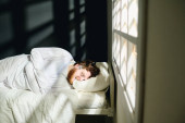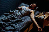 Butelka i szkło z whisky, zegar elektroniczny, tabletki nasenne i zdjęcia na małym stoliku nocnym przeciwko młodzieńcowi z zespołem pourazowym