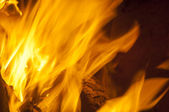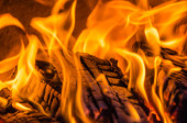 Ognisko na zewnątrz, płonąca kłoda drewna. Zbliżenie ogniska. Płomienie, żar i płonąca kłoda drewna. Scena spokoju i rekreacji z rodziną i przyjaciółmi.