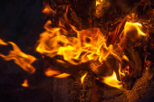 Zdjęcie "Ognisko na zewnątrz, płonąca kłoda drewna. Zbliżenie ogniska. Płomienie, żar i płonąca kłoda drewna. Scena spokoju i rekreacji z rodziną i przyjaciółmi. " może być wykorzystywane do celów osobistych i komercyjnych zgodnie z warunkami zakupionej licencji Royalty-free. Obraz jest dostępny do pobrania w jakości wysokiej rozdzielczości do 5760x3840.