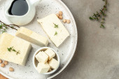 soy cheese tofu diced on a light background, Healthy vegan meatless meal rich in protein and calcium. Food recipe background. Close up,