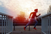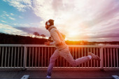 Młoda kobieta atleta ze słuchawkami biegnącymi przez most w zachodzie słońca