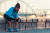 portret młodej atrakcyjnej kobiety słuchającej muzyki i robiącej selfie na świeżym powietrzu