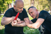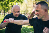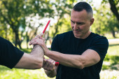 Zdjęcie "Muay tajski trener trzyma rękawice ostrości. Trening bokserski i demonstracja z podkładkami. Praktyka sztuk walki" może być wykorzystywane do celów osobistych i komercyjnych zgodnie z warunkami zakupionej licencji Royalty-free. Obraz jest dostępny do pobrania w jakości wysokiej rozdzielczości do 5760x3840.