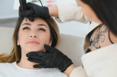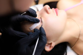 Zdrowy Spa: Młody piękna kobieta o Makijaż permanentny (tatuaż) na jej usta. Szczelnie-do góry.