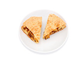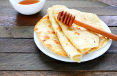 Dwa kawałki cienkich naleśników na złotym widelcu jedzenie tło miód