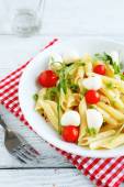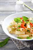 Makaron wegański z warzywami w misce, smaczne zdrowe jedzenie
