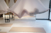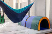 Sylwetka leżącej, wysportowanej dziewczyny całkowicie ukrytej przez czerwony hamak podczas relaksujących chwil w klasie antygrawitacyjnej jogi