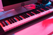 Top view of music producer or arranger using laptop, midi keyboard, and other audio equipmen to create music at home studio. Beat making, arranging audio content, composing song