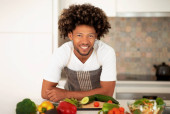 Zdjęcie "Dieta odwykowa. Szczęśliwy czarny facet gotowanie i picie szklanki zielonych warzyw smoothie stoi w nowoczesnej kuchni w domu. Zdrowa utrata masy ciała i przepisy wegetariańskie Concept" może być wykorzystywane do celów osobistych i komercyjnych zgodnie z warunkami zakupionej licencji Royalty-free. Obraz jest dostępny do pobrania w jakości wysokiej rozdzielczości do 5760x3840.