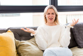 młoda ładna kobieta z głupim, szalonym i zaskoczonym wyrazem twarzy, uczucie wypchane, tłuste i pełne żywności